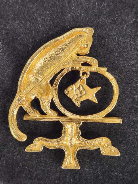 Vintage 1994 Avon cat with fishbowl brooch. Fish dangles.